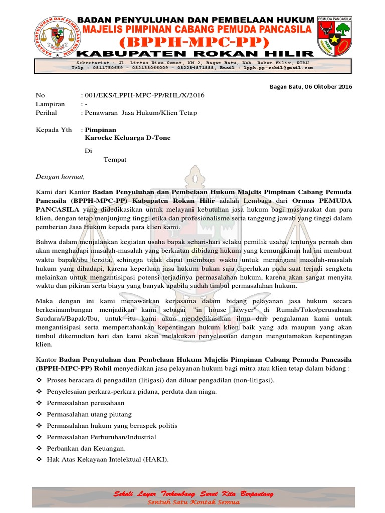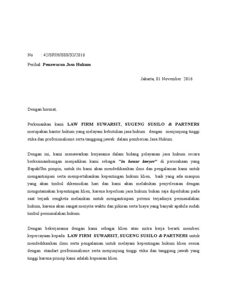 Contoh Surat Penawaran Kerjasama Jasa Hukum from imgv2-1-f.scribdassets.com Dengan surat penawaran jasa, pihak atau perusahaan lain bisa mengetahui jasa yang anda miliki dengan lebih cepat. Makmur kencana dengan menyertakan beberapa dokumen sebagai bahan pertimbangan. Contoh surat penawaran dan cara membuat yang baik dan benar. Surat penawaran barang dan jasa. Surat penawaran layanan adalah salah satu jenis surat resmi yang diterbitkan oleh pelaku usaha atau perusahaan yang intinya adalah menawar. Surat ini bisa dibuat atas inisiatif perusahaan, atau. Jika iya, sekarang anda membaca artikel yang tepat. Mengupas praktik hukum perseroan dan korporasi.