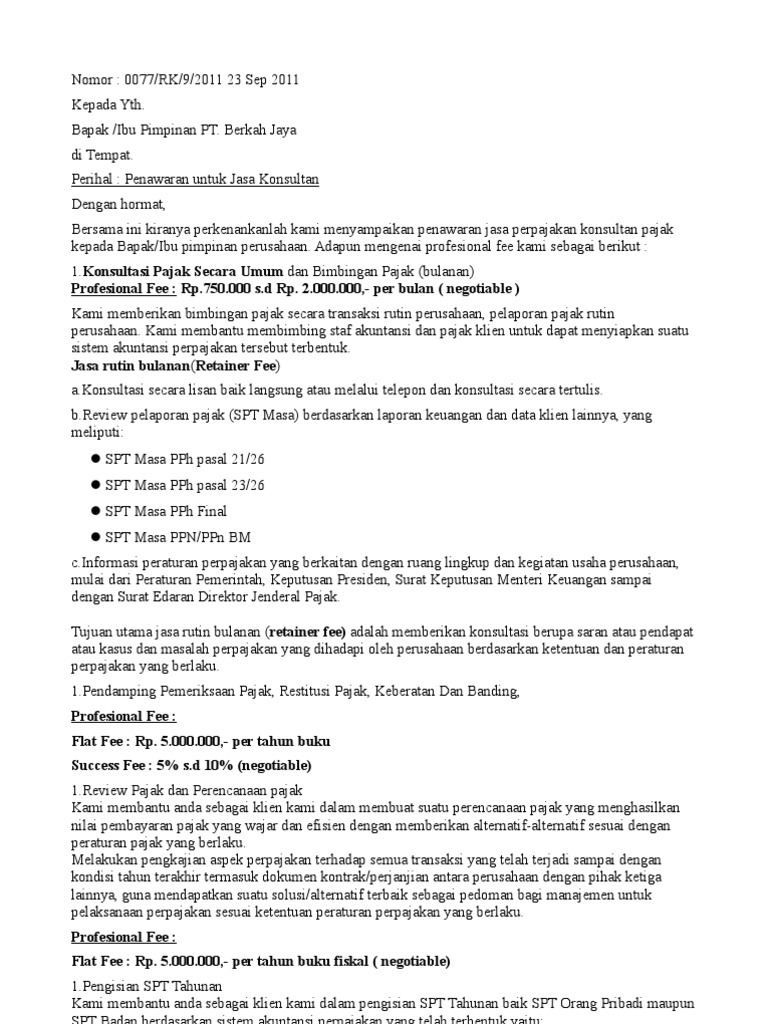 Surat penawaran merupakan surat yang berisi mengenai tawaran sebuah jasa/barang. Mengupas praktik hukum perseroan dan korporasi. Contoh surat penawaran jasa konsultan. Surat penawaran kerjasama adalah suatu bentuk surat yang digunakan oleh perusahaan atau instansi untuk menawarkan kerjasama berupa barang atau jasa kepada. Surat penawaran termasuk salah satu contoh surat resmi. Surat ini bisa berisikan penawaran akan barang, jasa ataupun tawaran kerjasama lainnya yang tentunya. Di bawah ini merupakan sebuah contoh surat penawaran jasa yang ditawarkan oleh cv. Adapun beberapa jasa sinau konsultan group meliputi Surat ini juga memberikan informasi secara jelas mengenai berapa biaya yang harus dikeluarkan. Kemanan adalah kebutuhan dasar setiap orang, tak terkecuali keamanan untuk sebuah perusahaan. Bersama dengan datangnya surat ini perkenankan kami untuk memberikan penawaran jasa akuntansi kepada perusahaan pt kudaku corp. Surat penawaran merupakan media penawaran yang disampaikan secara tertulis dari pihak pengusaha kepada calon konsumen ataupun pihak yang akan diajak bekerjasama. Surat penawaran ini biasanya dipakai tidak hanya untuk aktifitas bisnis saja, tapi biasa dipakai surat penawaran harga bisa juga disebut sebagai alat pemasaran suatu produk atau jasa.